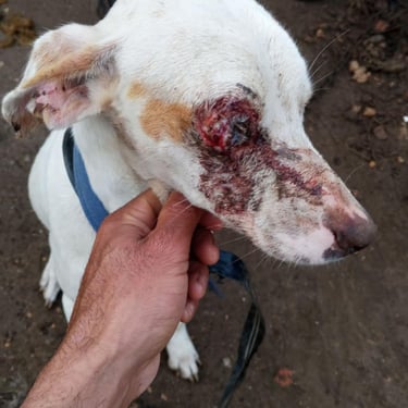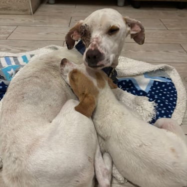 Une petite maman en souffrance, immense, intense, insupportable !!! Et ça fait des jours que ça dure !!! Une pourriture d'humain lui a tiré un coup de fusil dans son oeil droit, la balle est ressortie à l'arrière de son cou, juste parce que, affamée, elle a tué une poule !!! Ses bébés sont tous morts sauf un... L'endroit est sordide, en pleine campagne, elle vit enchaînée, elle n'a quasiment rien à manger, ni à boire, et ses chiots qui la têtent tout le temps, eux aussi, affamés, l'épuisent.