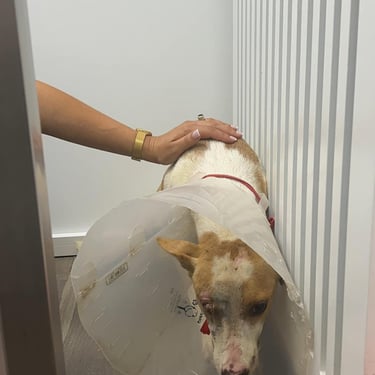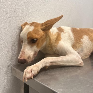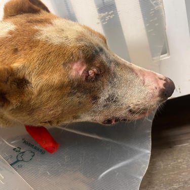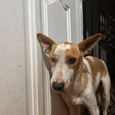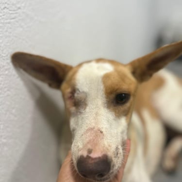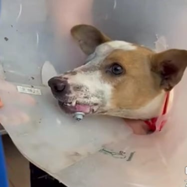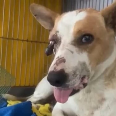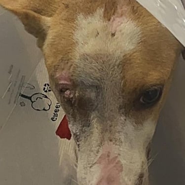 Lucie, chienne martyre de Tunisie. Lucie a été fracassée : oeil arraché et grosse fracture de la mâchoire qui l'ont plongée dans une immense douleur et un profond traumatisme. Le chemin sera long pour réparer son traumatisme moral : elle est tétanisée, mais totalement inoffensive, quand on l'approche, elle se demande ce qu'on va encore lui faire subir ?