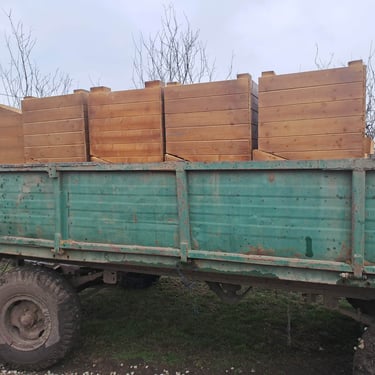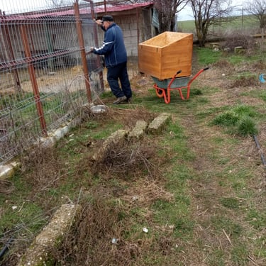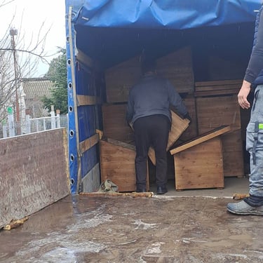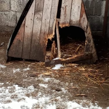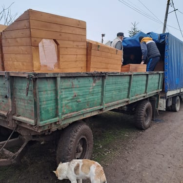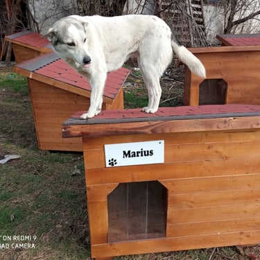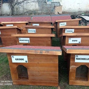 Nos fidèles donateurs se sont mobilisés, les uns offrant une niche, d'autres se groupant pour en acheter une, d'autres enfin en achetant plusieurs. Tous ont eu la possibilité de choisir un nom à apposer sur leur niche, en général, le nom d'un chien qu'ils aiment ou ont aimé, ou le nom d’un être disparu, chien ou humain... Les menuisiers roumains se sont activés et les niches ont été livrées tranches par tranches, mais c’était sans compter sur l’hiver roumain et le camion qui était censé livrer les niches s’est embourbé par deux fois et il a fallu faire appel à un paysan qui est venu dépanner avec son tracteur et sa remorque pour que les niches arrivent à bon port. La tâche était énorme, les niches, bien solides, étaient bien lourdes à transporter dans la neige et la boue... Mais avec de la volonté et de l'obstination, on y est arrivés !